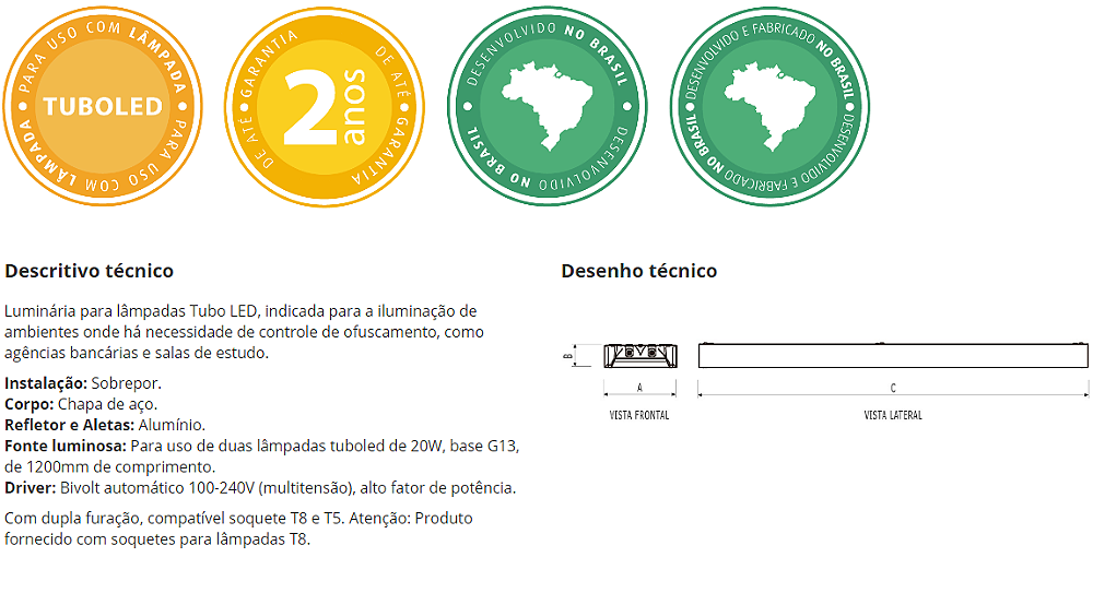 Luminária Comercial Alto Rendimento de Sobrepor com Difusor em Acrílico Leitoso para Lâmpada Led T8 2x18W 20W - Claron